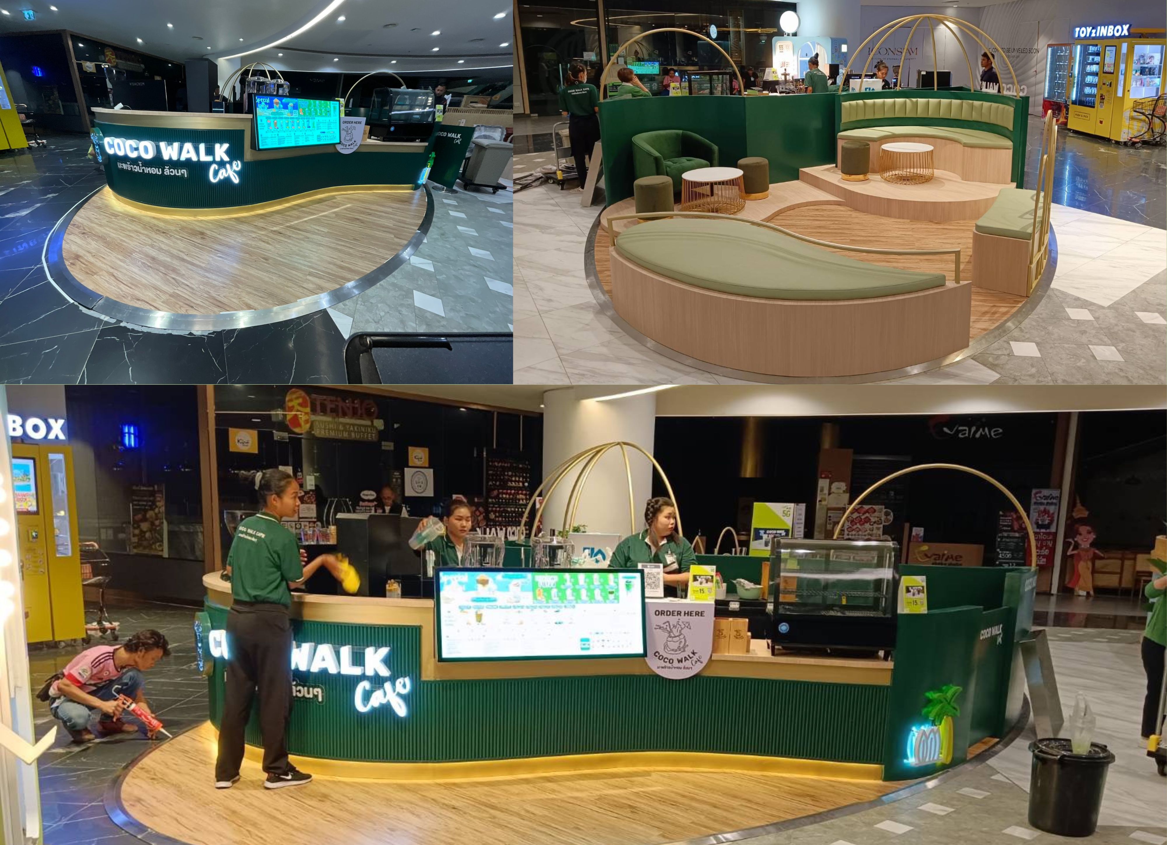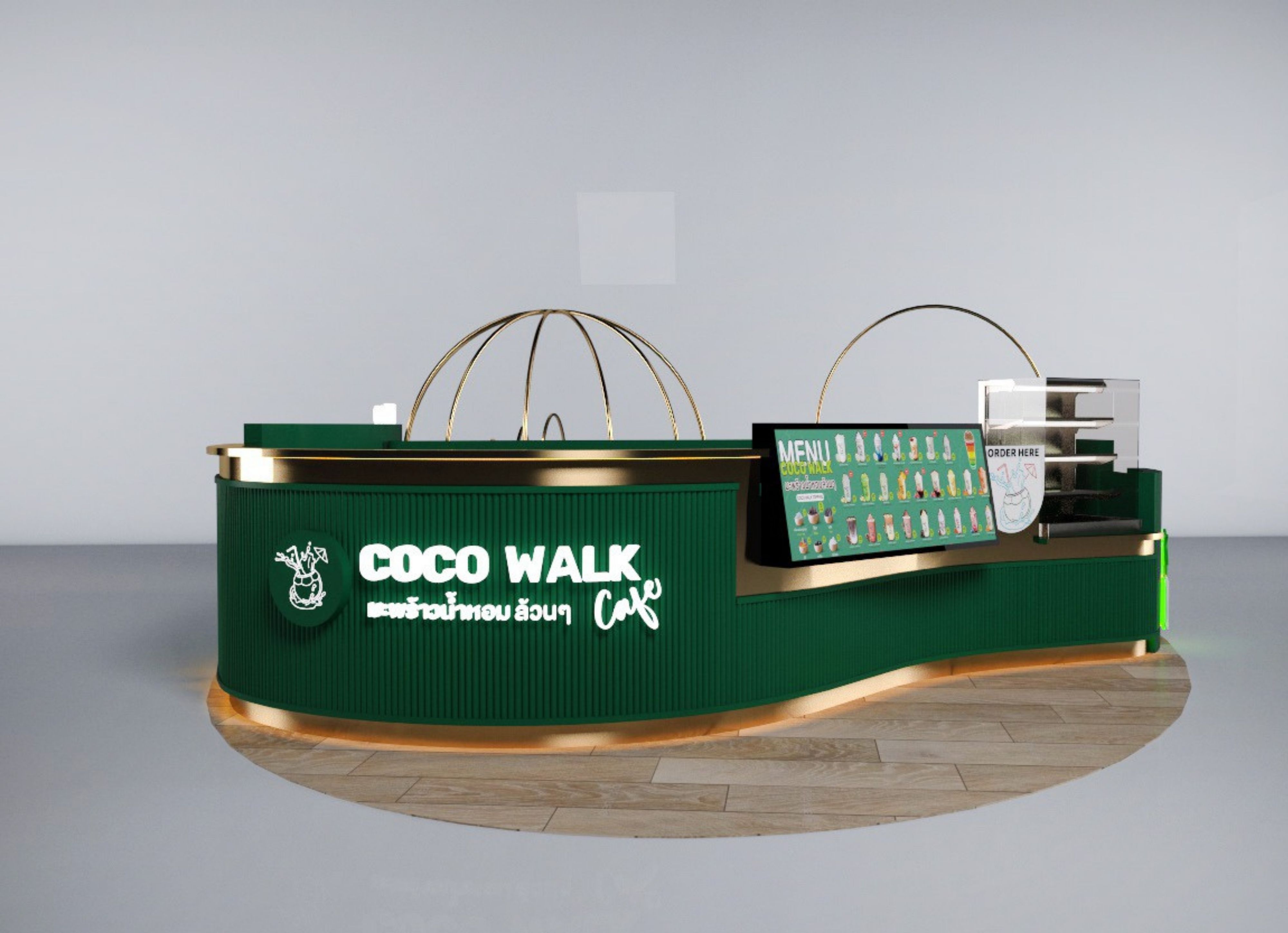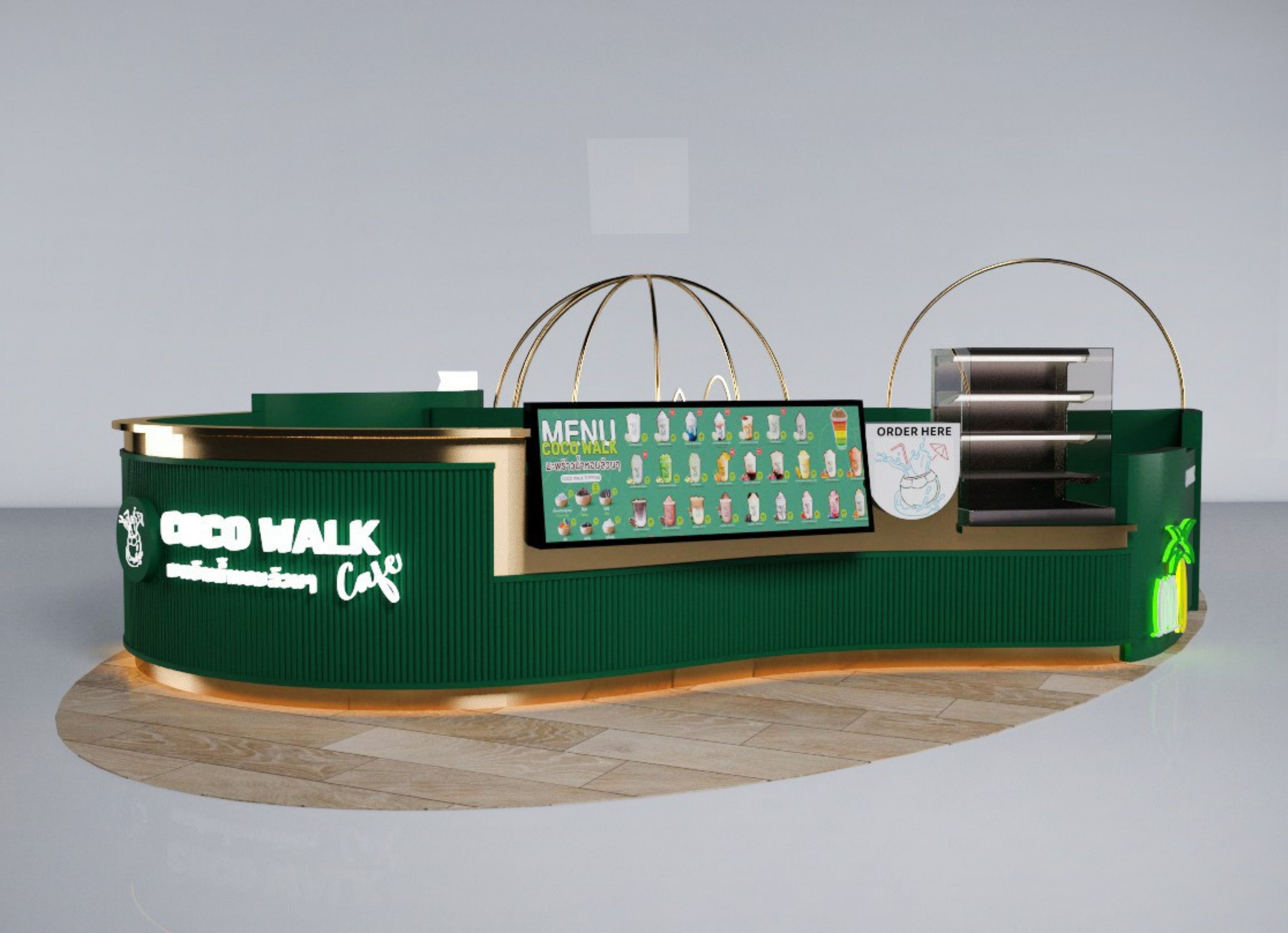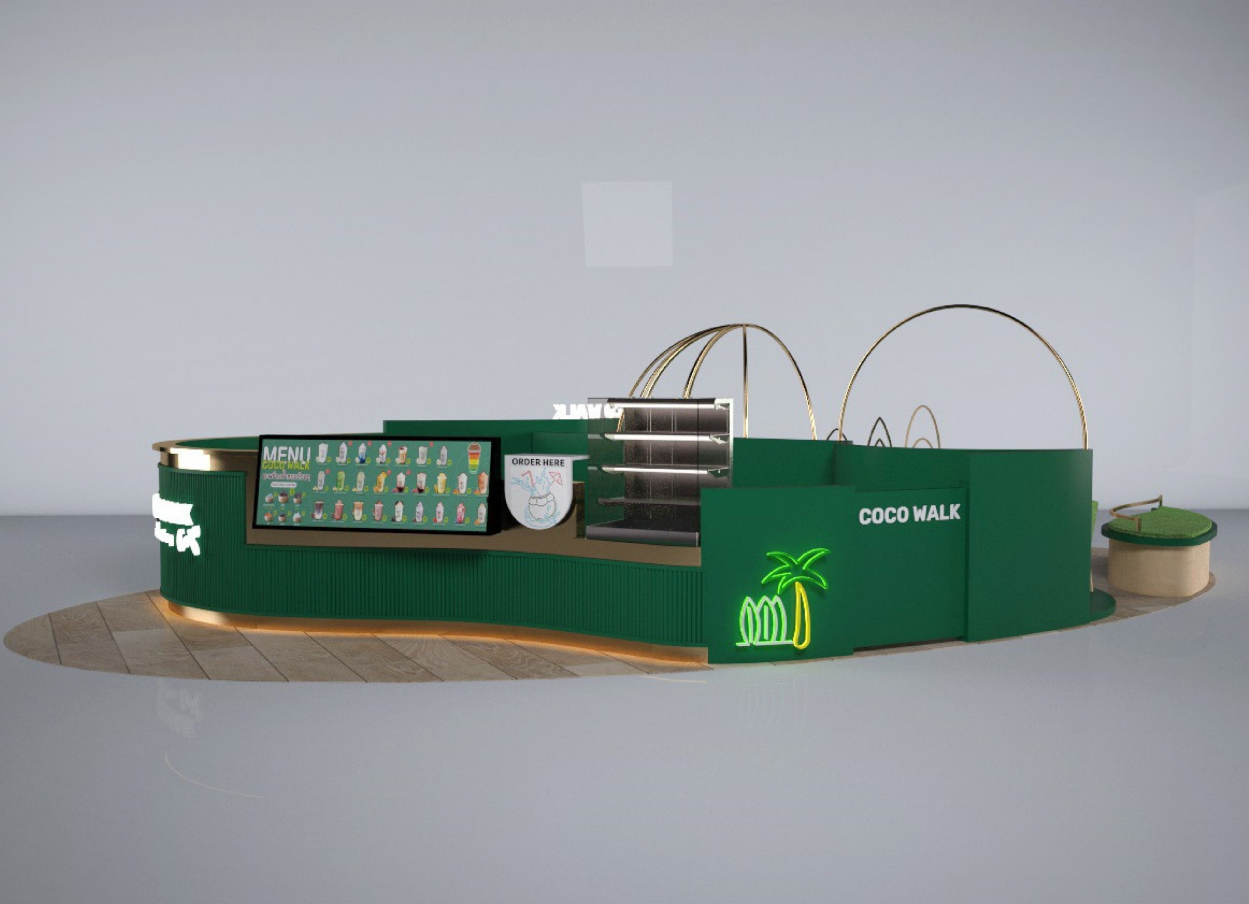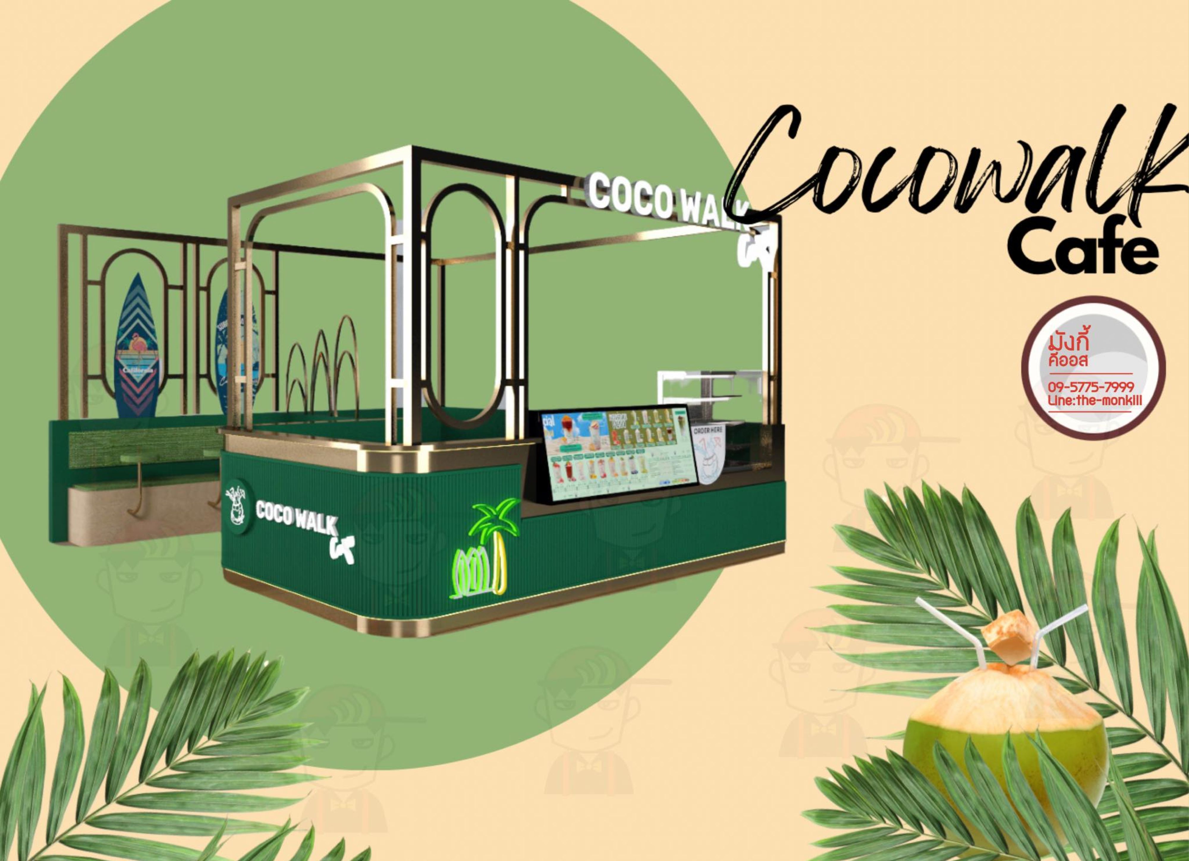 สัมผัสเอกลักษณ์ความสดชื่นของมะพร้าวน้ำหอมผ่านโปรเจกต์ ร้านกาแฟ COCOWALK CAFÉ ที่เราฉีกกฎดีไซน์แบบเดิมๆ ด้วยสไตล์ Tropical Luxury อันโดดเด่น โดยเลือกใช้โทนสี "Deep Emerald Green" (เขียวมรกต) ตัดกับสีทองหรูหรา (Gold Glossy) เพื่อสร้างภาพจำที่ดูแพงแต่ยังคงความสดชื่นตามธรรมชาติไว้อย่างเต็มเปี่ยม เพิ่มความน่าสนใจด้วยโครงสร้างเหล็กดัดทรงโค้งมนที่ได้รับแรงบันดาลใจจากรูปทรงของผลมะพร้าวและคลื่นทะเล พร้อมลูกเล่นป้ายไฟ Neon Sign รูปต้นมะพร้าวที่ช่วยสร้างบรรยากาศสนุกสนานและเป็นจุดดึงดูดสายตา (Eye-catching) ได้ดีเยี่ยมไม่ว่าจะตั้งอยู่ในห้างสรรพสินค้าหรือย่านธุรกิจ