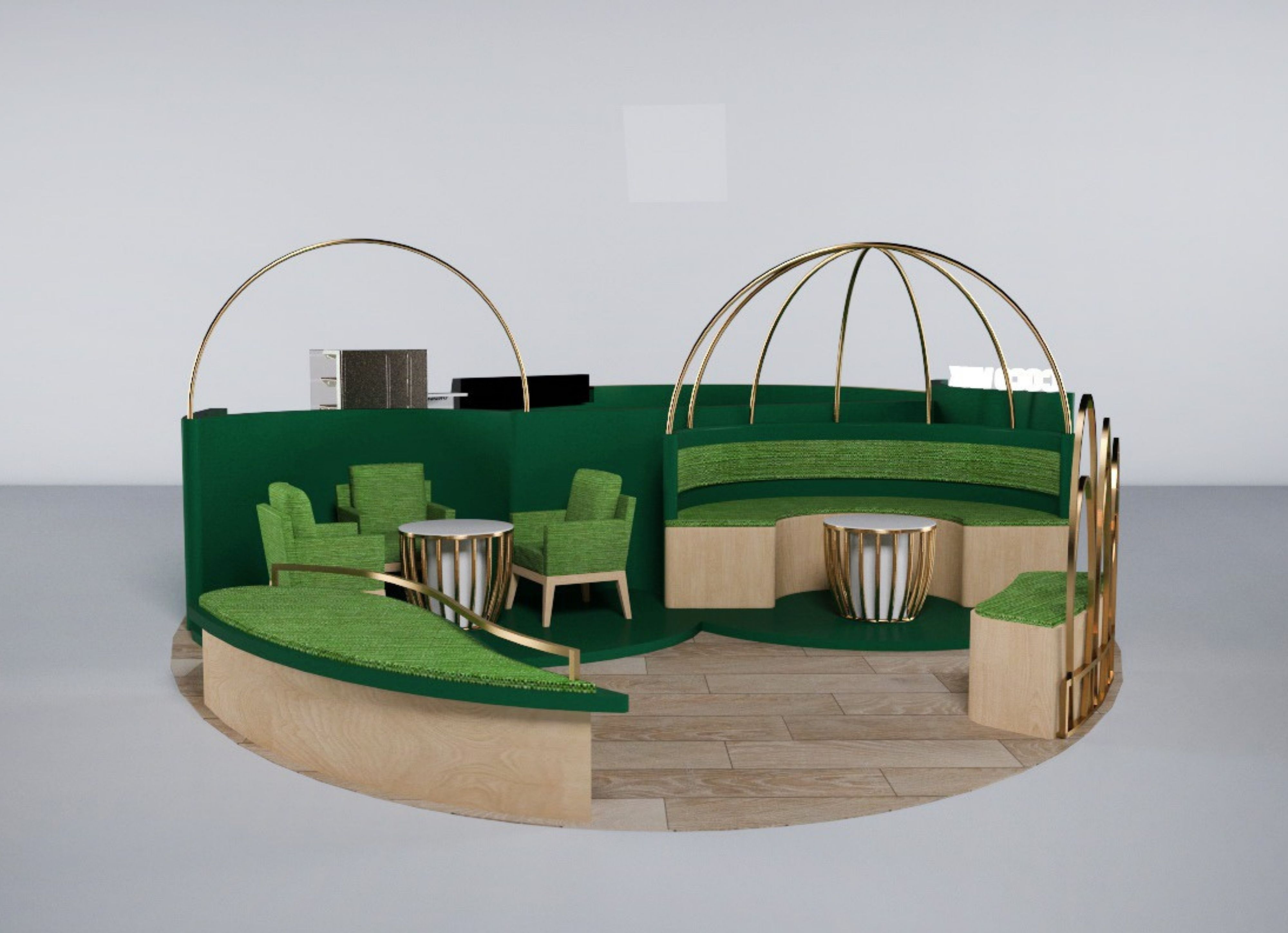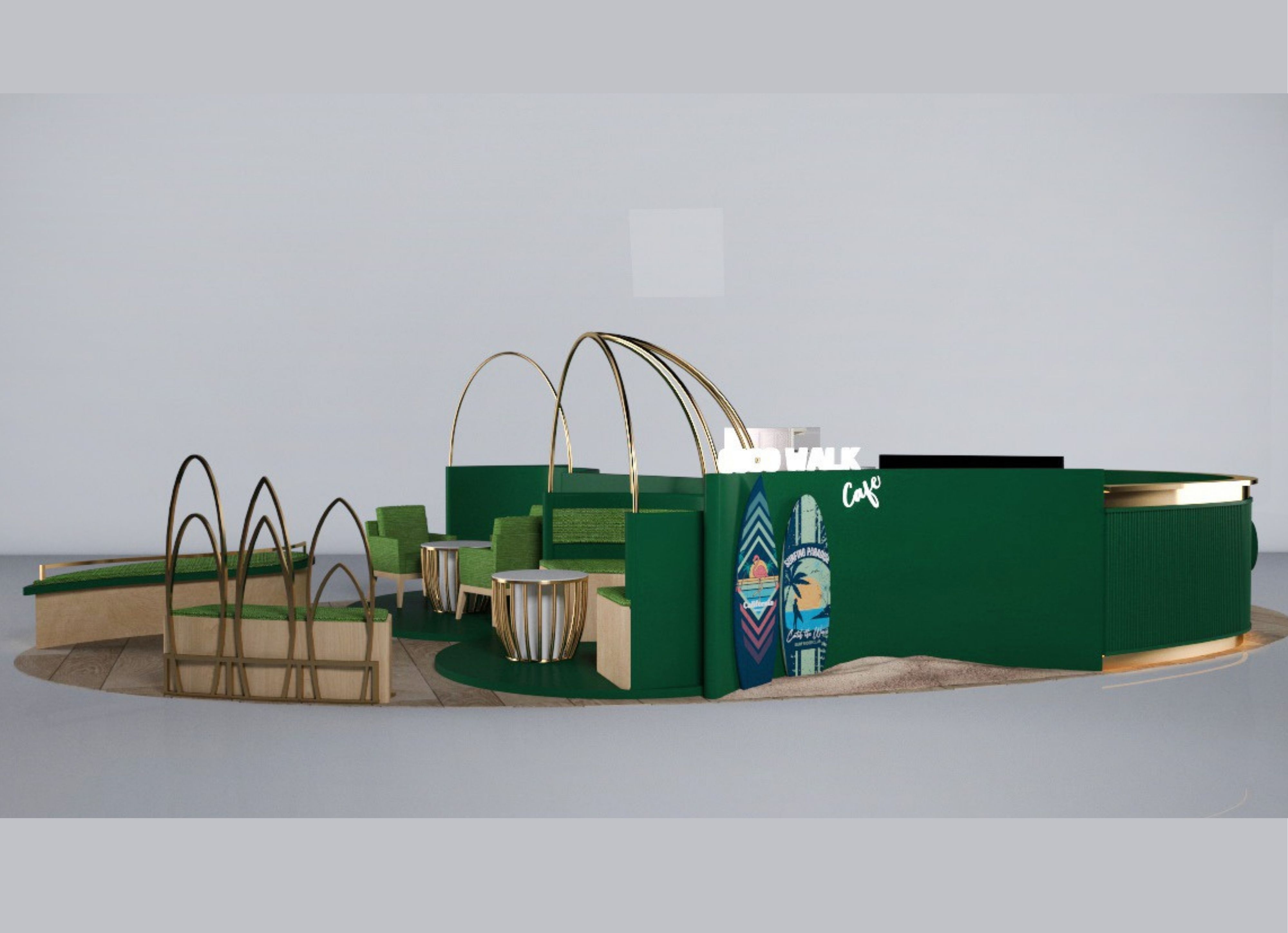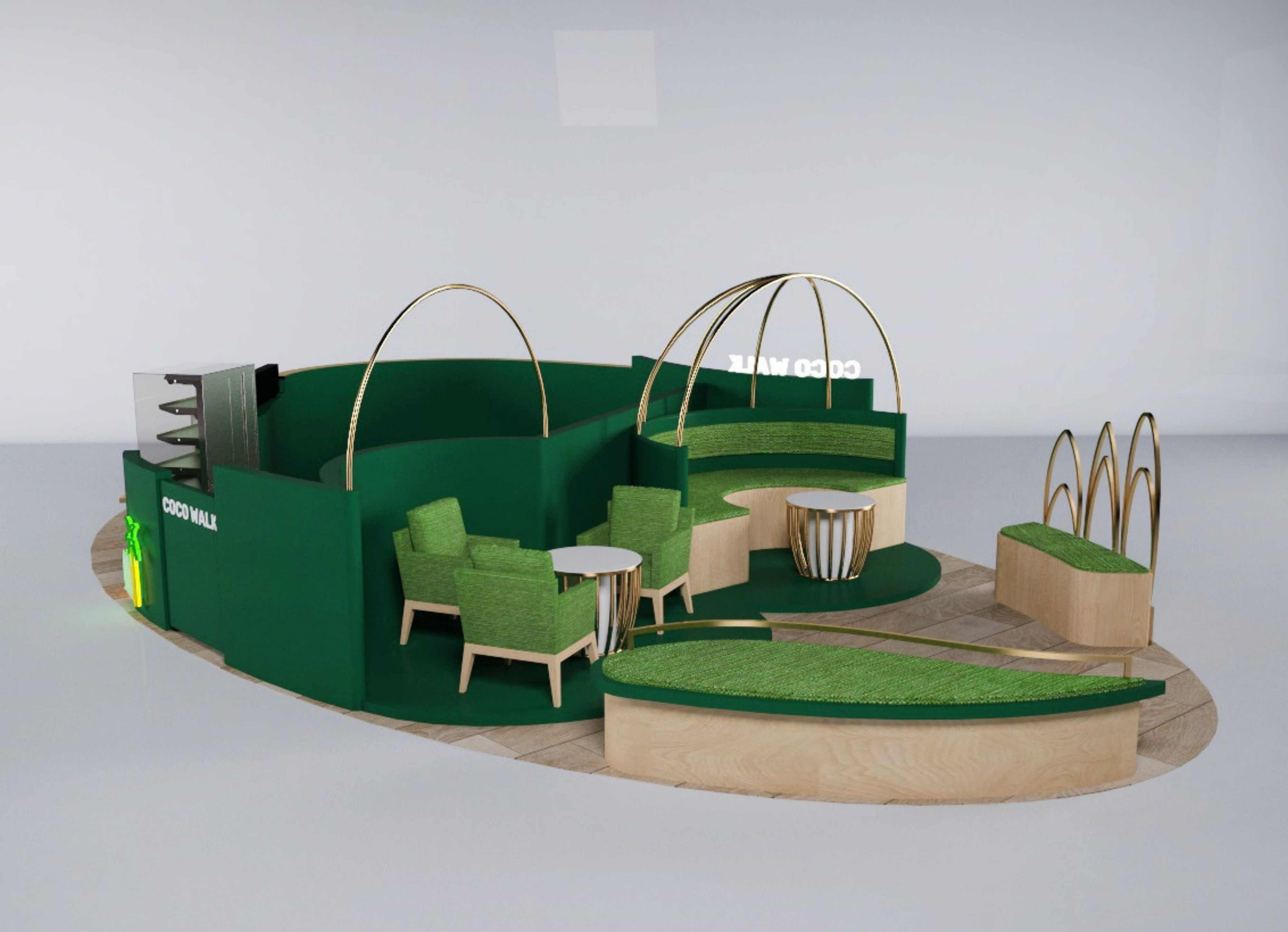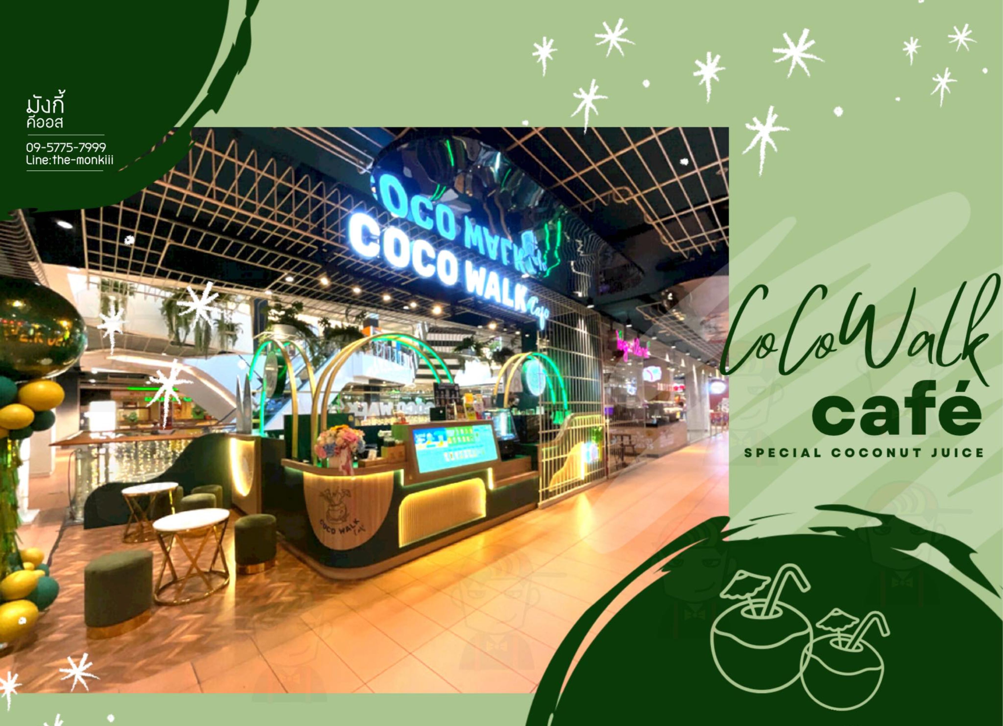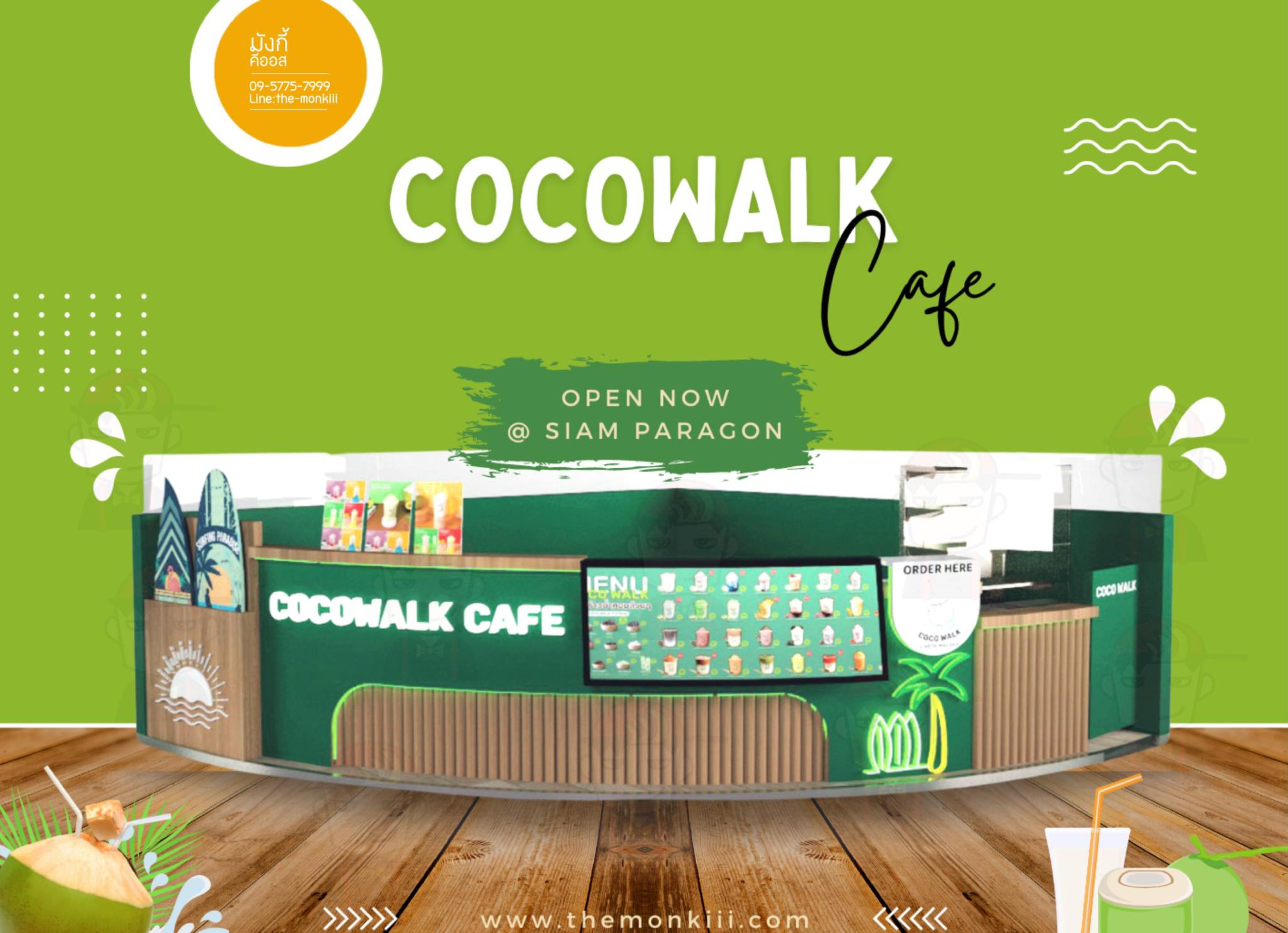 สัมผัสเอกลักษณ์ความสดชื่นของมะพร้าวน้ำหอมผ่านโปรเจกต์ ร้านกาแฟ COCOWALK CAFÉ ที่เราฉีกกฎดีไซน์แบบเดิมๆ ด้วยสไตล์ Tropical Luxury อันโดดเด่น โดยเลือกใช้โทนสี "Deep Emerald Green" (เขียวมรกต) ตัดกับสีทองหรูหรา (Gold Glossy) เพื่อสร้างภาพจำที่ดูแพงแต่ยังคงความสดชื่นตามธรรมชาติไว้อย่างเต็มเปี่ยม เพิ่มความน่าสนใจด้วยโครงสร้างเหล็กดัดทรงโค้งมนที่ได้รับแรงบันดาลใจจากรูปทรงของผลมะพร้าวและคลื่นทะเล พร้อมลูกเล่นป้ายไฟ Neon Sign รูปต้นมะพร้าวที่ช่วยสร้างบรรยากาศสนุกสนานและเป็นจุดดึงดูดสายตา (Eye-catching) ได้ดีเยี่ยมไม่ว่าจะตั้งอยู่ในห้างสรรพสินค้าหรือย่านธุรกิจ